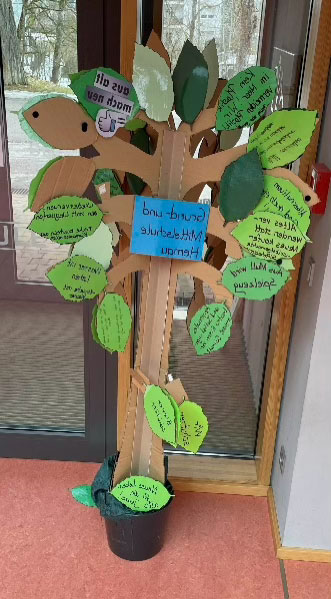 Zum Abschluss trafen sich alle Schülerinnen und Schüler erneut in der Aula. Gemeinsam wurde besprochen, welches neue Wissen über Umwelt und Nachhaltigkeit in den einzelnen Workshops gewonnen wurde. Diese Gedanken hielten die Kinder auf Blättern fest, die anschließend an einen Baum gehängt wurden. Dieser Baum steht nun symbolisch in der Aula der Grundschule und soll uns alle immer wieder daran erinnern, dass Nachhaltigkeit im Kleinen beginnt und jede und jeder von uns einen Beitrag dazu leisten kann.
