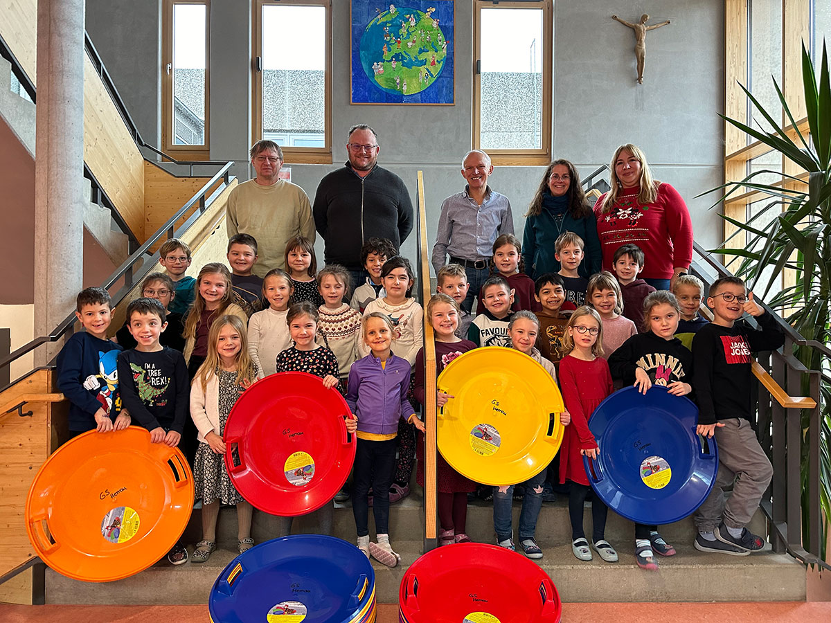 Nachdem viele „Schneefahrzeuge“ der Schüler:innen der Grundschule mittlerweile „aus Altersgründen“ ausgedient haben, dürfen sich die Kinder in der GS über neue „Fortbewegungsmittel“ im Schnee freuen. Der Elternbeirat nahm sich der Bedürfnisse der Kinder an und spendierte 30 „Tellerrutscher“, um den Kindern die Freude und den Spaß am Wintertreiben zurückzubringen.